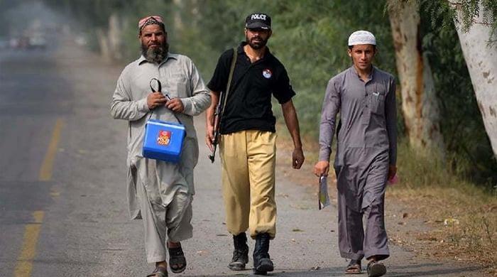 Representational image shows police personnel guarding polio workers. — Reuters/FileWeapons snatched from police in Quetta.PM says attack on anti-polio workers ‘intolerable’.29 polio cases reported so far in 2025.