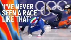 An "extraordinary" women's 1500m speed skating semi-final at the 2026 Winter Olympics sees six of the seven skaters crash, with China's Yang Jingru - the only athlete not to fall - finishing first.