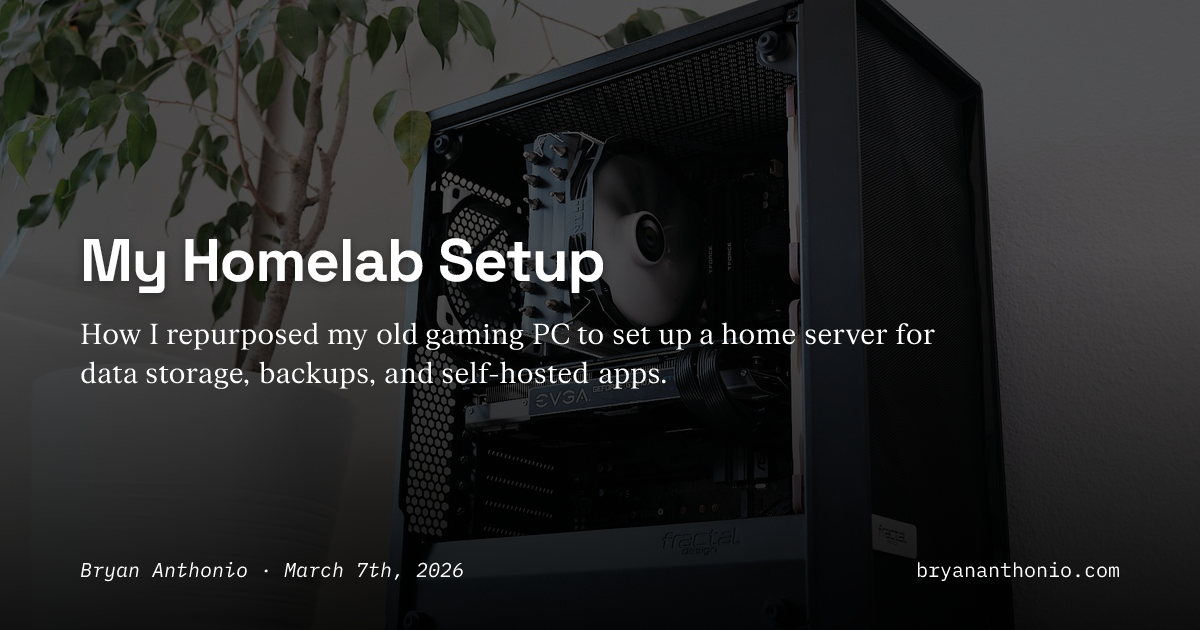 Article URL: https://bryananthonio.com/blog/my-homelab-setup/ Comments URL: https://news.ycombinator.com/item?id=47298743 Points: 31 # Comments: 21